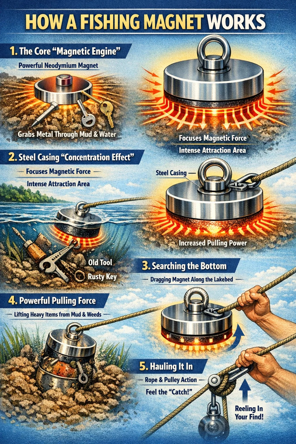 Abychom pochopili, jak a rybářský magnet funguje, můžete si ho představit jako supervýkonný „podvodní vysavač“, až na to, že místo prachu vysává kov.