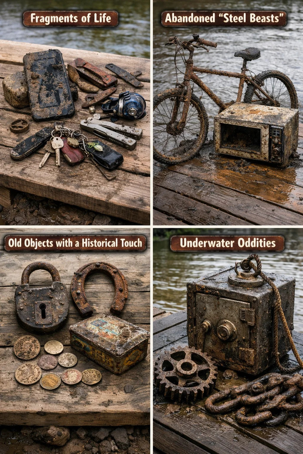 Průmyslové díly: Obrovská ozubená kola, zrezivělé řetězy nebo jakési součásti továrních strojů, jejichž jména už nejsou rozpoznatelná. Trezory a kovové krabice: Objevení trezoru je často vrcholem magnetického rybolovu, ai když obsahuje pouze bahno a písek, pocit úspěchu z prozkoumávání neznáma nemá obdoby.
