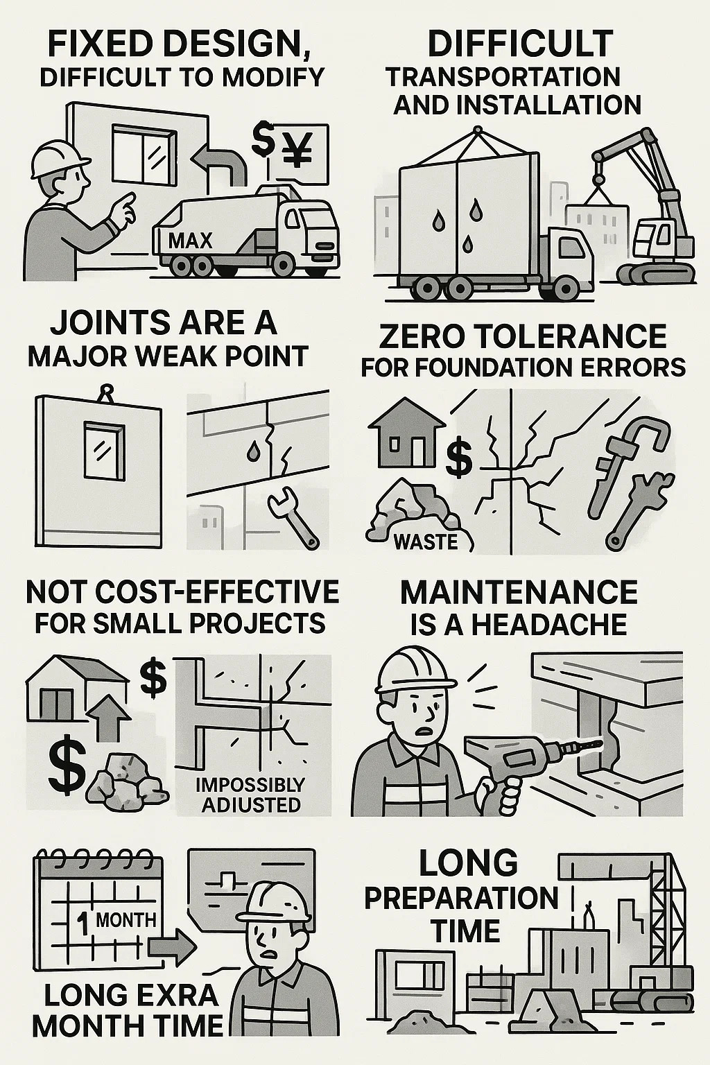 Sanace na místě je obtížná: Pokud se při dodání zjistí, že rozměry součástí jsou nesprávné, není možné je upravit na místě řezáním výztužných tyčí jako u litých konstrukcí.
