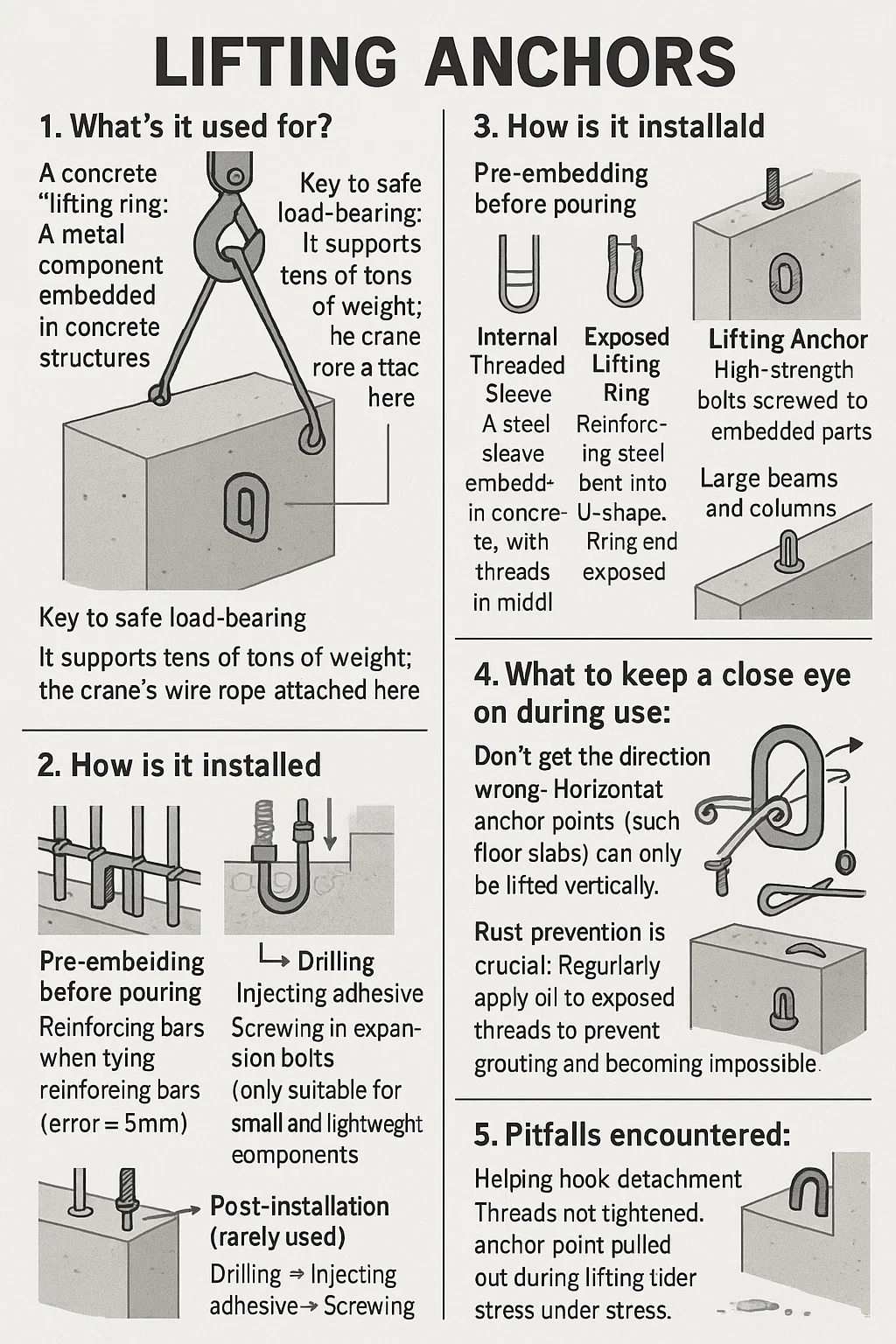Betonový „zvedací kruh“: Kovová součást zapuštěná do betonových konstrukcí (stěnové panely, schodiště, trámy). Háky nebo šrouby jsou přišroubovány přímo na něj pro zvedání.