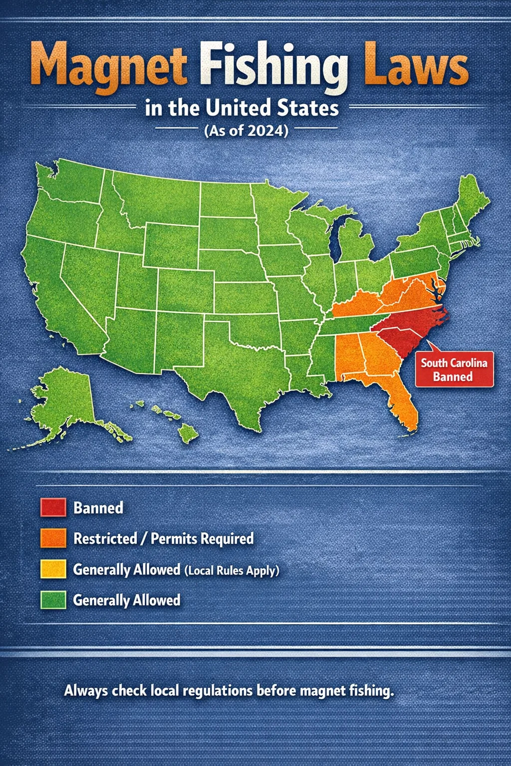 Většina států USA v současné době povoluje magnetový rybolov bez konkrétního zákazu na úrovni státu. Od roku 2024 pouze Jižní Karolína má výslovný celostátní zákaz magnetového rybolovu , což z ní činí jednu jasnou odlehlou hodnotu. Nicméně „ve výchozím nastavení povoleno“ neznamená neomezené. Desítky států mají předpisy o vodních cestách, požadavky na povolení nebo místní vyhlášky, které přímo ovlivňují, kde a jak můžete použít rybářský magnet. Než přivážete neodymový magnet na lano a pustíte ho do řeky, musíte porozumět nejen státním zákonům, ale také pravidlům okresu, vlastnictví půdy a konkrétní vodní ploše, na kterou se zaměřujete.