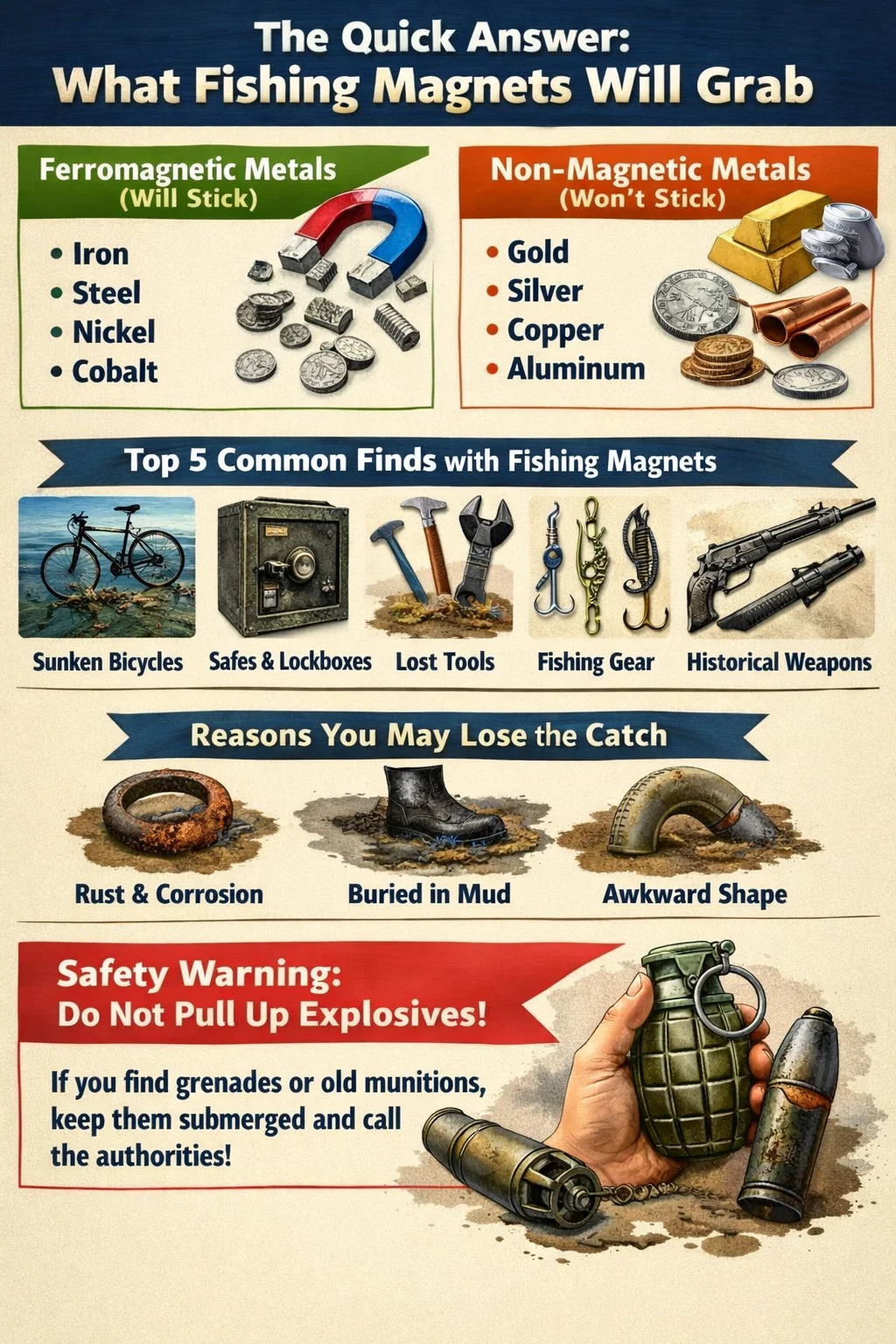Zatímco rybářské magnety jsou nástrojem objevování, mohou také najít nebezpečí. V mnoha částech Evropy a některých částech USA lze vytáhnout nevybuchlou munici (UXO), jako jsou granáty nebo staré minometné granáty. Tyto položky mohou být stále aktivní a extrémně nebezpečné. Pokud uvidíte něco, co vypadá jako výbušnina, nedotýkejte se toho , pokud je to možné, držte jej ponořený a okamžitě zavolejte bombový tým.